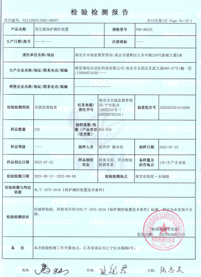我司2023年9月15日簽收南京市產(chǎn)品質(zhì)量監(jiān)督檢驗院抽檢合格反饋通知單及產(chǎn)品檢驗檢測報告。